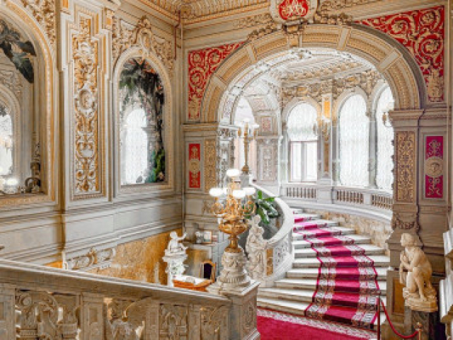 - Малиновая гостиная: шёлковые стены, ренессансная мебель, венецианская люстра — здесь проходили музыкальные вечера и закрытые великосветские приемы;