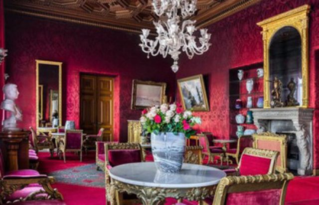 Малиновая гостиная с люстрой венецианского стекла и потрясающим видом на Неву и Петропавловскую крепость;