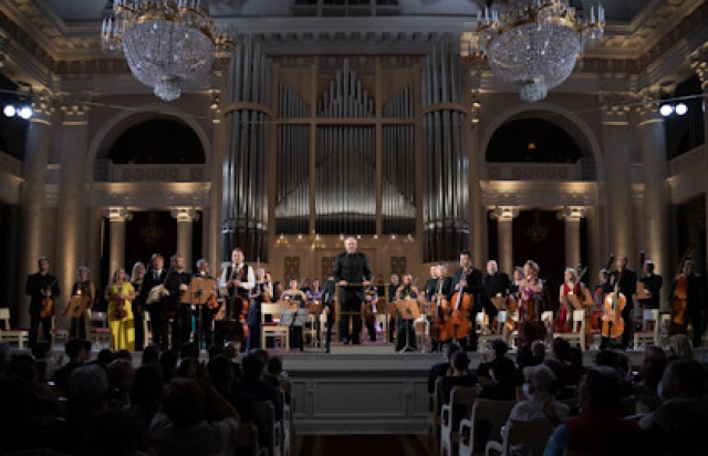 На сцене Большого зала филармонии - Singolo Orchestra и лауреаты международных конкурсов дирижер Антон Гаккель и виолончелист Дмитрий Ганенко.